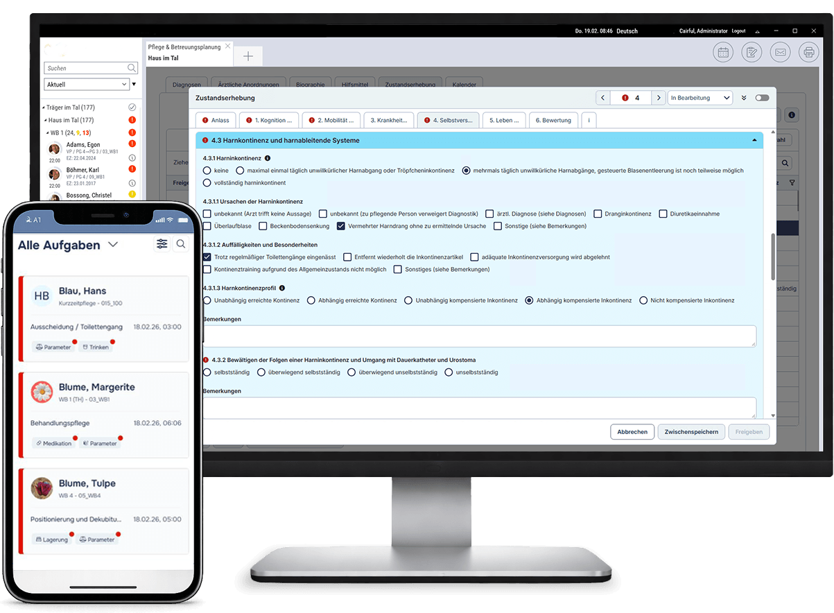 Geocon Cairful wurde speziell für die stationäre Altenpflege entwickelt – nicht nur von Programmierern, sondern auch von Pflegekräften selbst. Es berücksichtigt die fachlichen Anforderungen rechtssicher und begegnet den Alltagsproblemen pragmatisch.